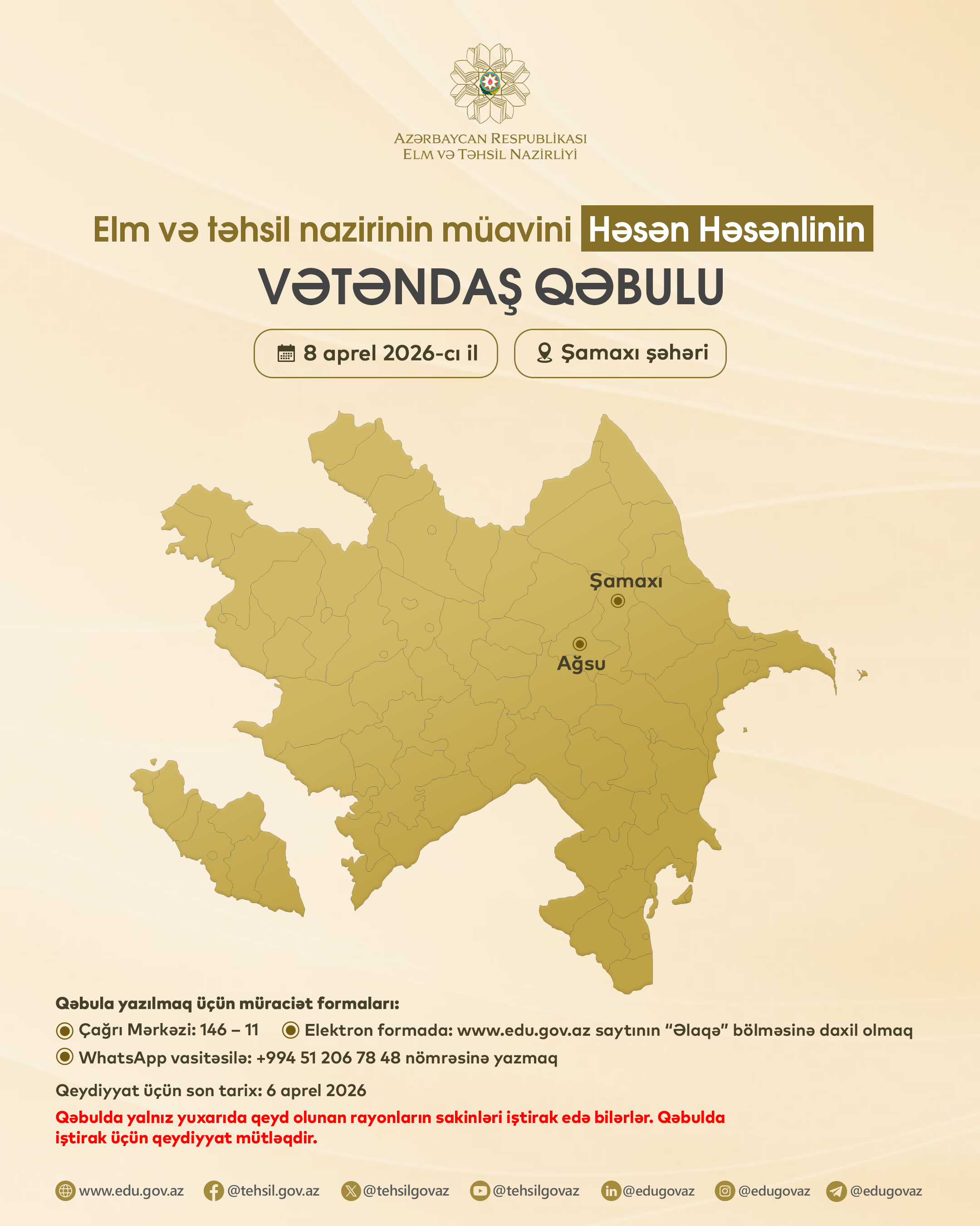 AzEdu.az xəbər verir ki, qəbulda Şamaxı və Ağsu sakinləri iştirak edə bilərlər.